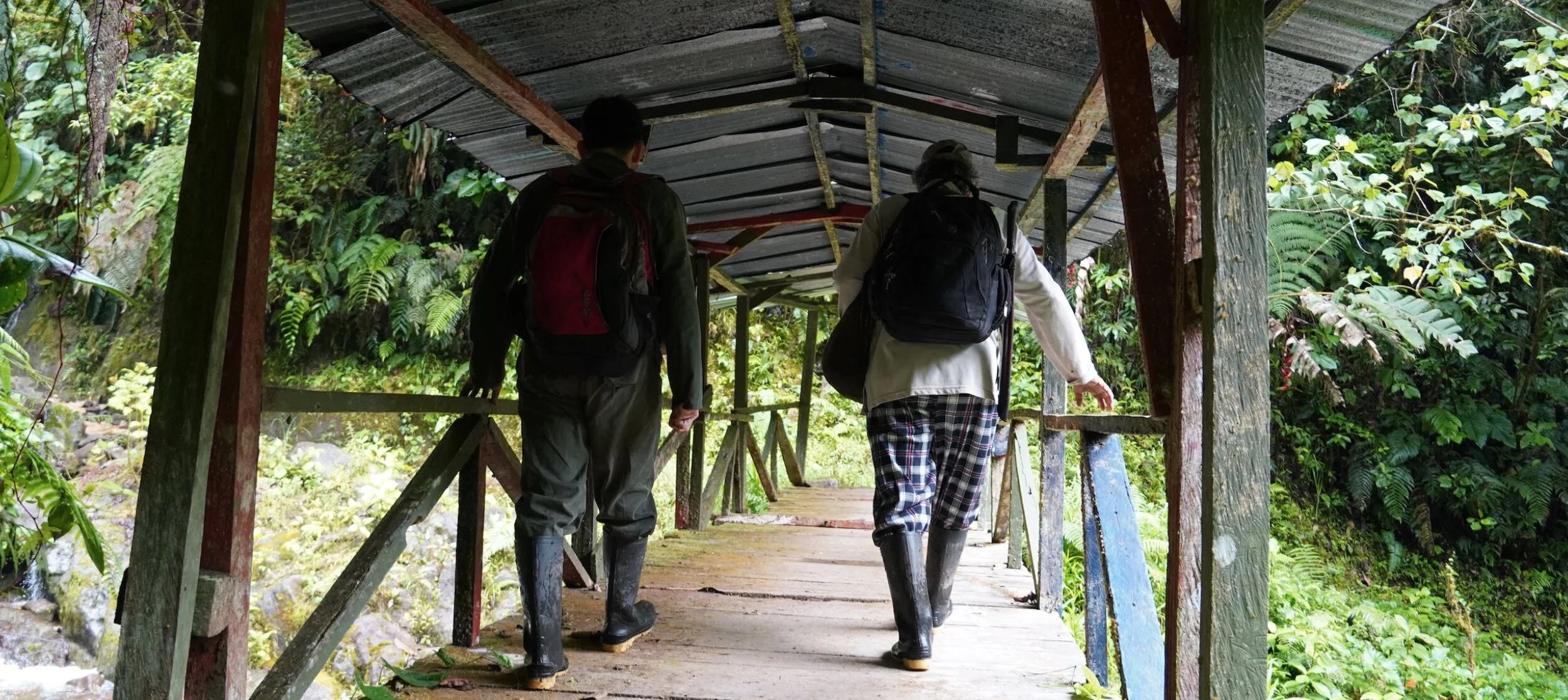 Junto con el guardabosques Arcesio Gómez nos preparamos para siete o máximo ocho horas de caminata el primer día, con la idea de descansar en la vereda La Esperanza. Sin embargo, en el Putumayo, el tiempo lo decide la selva. Allá no hay afán. Los aguaceros repentinos, las empinadas montañas y los deslizamientos de tierra marcan el andar. Nueve horas después de iniciar la travesía llegamos a la caudalosa quebrada la Tortuga, un afluente profundo y bravío que, según Arcesio Gómez, se afectará de manera directa por las obras viales. Es uno de los más de quince cuerpos de agua, entre caños y quebradas, que vimos cuando transitamos por el sendero Sachamates. Sus aguas abastecen a la capital de Putumayo y son vitales para ríos como Mocoa y, luego, el gigantesco Putumayo.