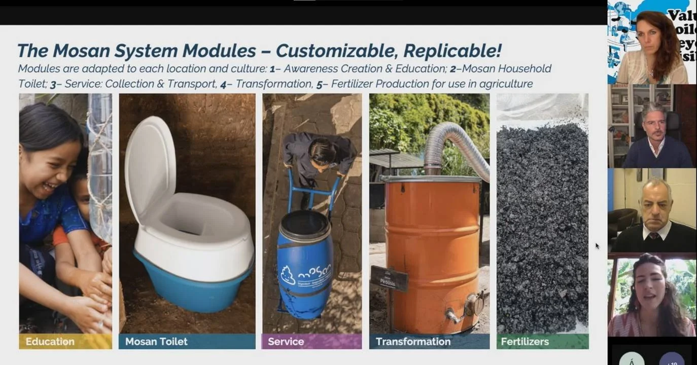 Seguidamente, intervino Mona Mijthab, fundadora de Mosan Sanitation Solutions, poseedora de una amplia experiencia en acceso al saneamiento en todo el mundo, quien explicó el desarrollo del Mosan, un sistema circular regenerativo, en Guatemala, país con seis millones de personas carentes de un saneamiento seguro, y en concreto en las comunidades del lago Atitlán, donde se vierten cada segundo 500 litros de aguas residuales sin tratamiento.