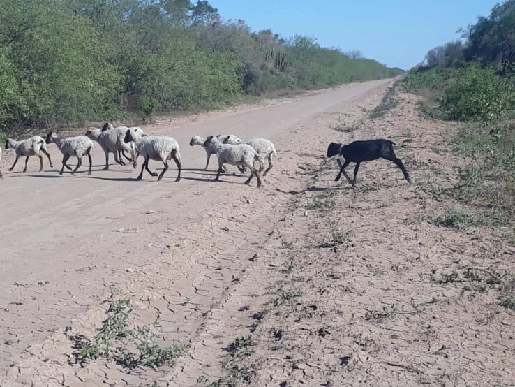 Algunas cabras cruzan un camino de tierra en El Impenetrable un ecosistema de cuatro millones de hectáreas, donde se práctica la ganadería extensiva: los animales se crían sueltos y recorren la zona en busca de pastos. Foto: Daniel Gutman / IPS