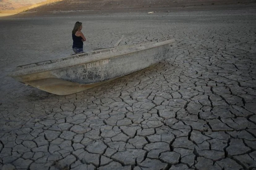 Un bote hundido se asienta sobre tierra agrietada a cientos de pies de lo que ahora es la costa del lago Mead, uno de los embalses nutridos por el río Colorado, el lunes 9 de mayo de 2022, cerca de Boulder City, Nevada. JOHN LOCHER (AP)