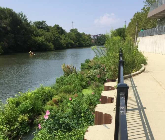 Los jardines flotantes son esencialmente estructuras que flotan sobre el agua y que albergan plantas. A medida que las plantas crecen, extienden sus raíces en el agua, creciendo hidropónicamente. En un antiguo canal industrial de Chicago se está construyendo un parque ecológico flotante de más de un kilómetro de largo de largo. Como parte del parque, se están instalando jardines flotantes, pegados a la orilla.