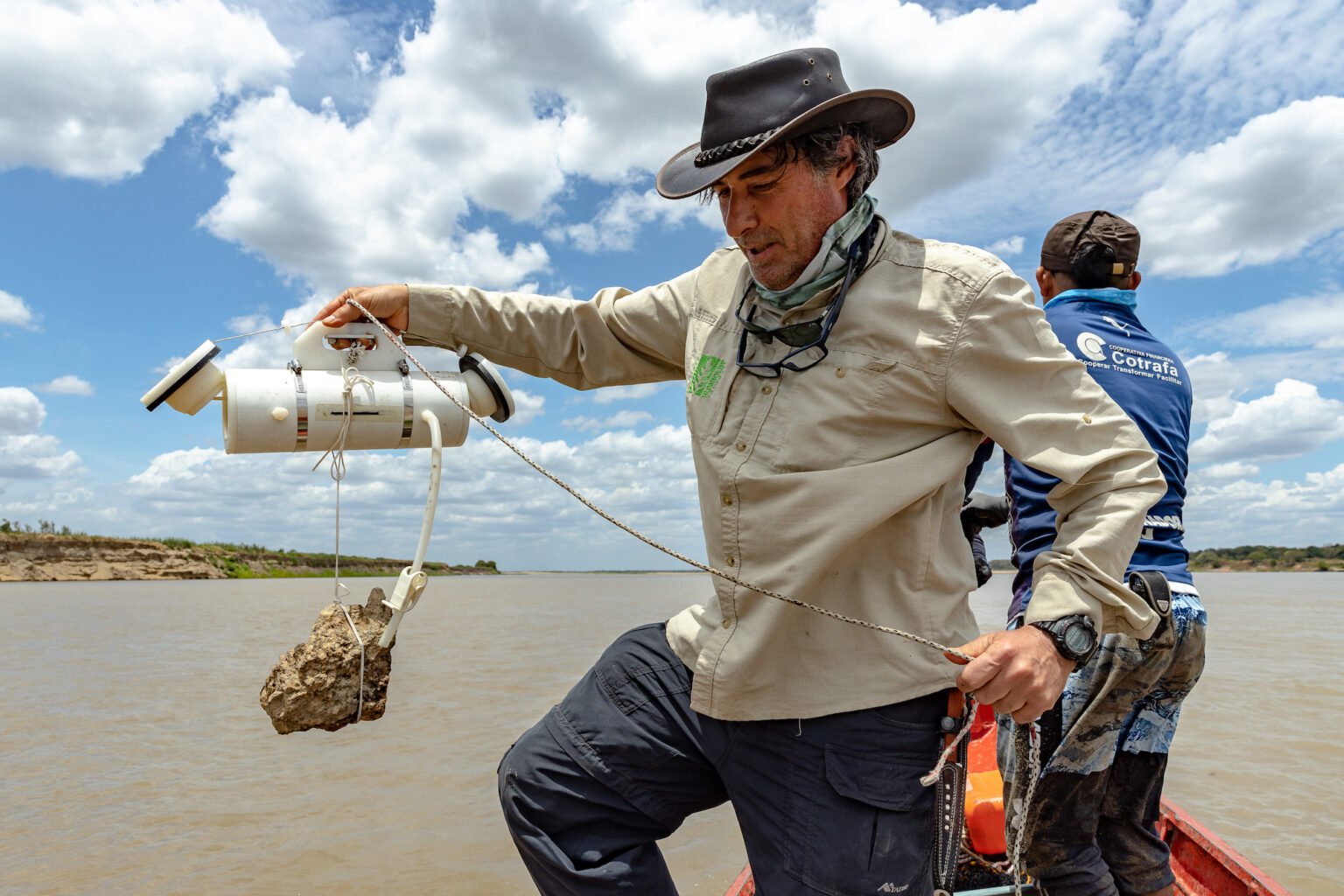 Algo que sí está en manos del humano, de manera directa, es no dragar los ríos para temas de navegabilidad. En estos grandes ríos americanos, durante la época de aguas altas, pueden superar los 60 o 70 metros y pueden navegar embarcaciones grandes. Lo hacen con el casco menos profundo en esta parte media del Orinoco, pero ya en la parte baja, hacia el Delta, entran grandes barcos. Tristemente, en la parte baja hay que dragar y, al hacerlo, destruyen los fondos y matan a los peces que están allí. Afortunadamente, hacia esta parte media del Orinoco no se hacen los dragados, pero sí es una amenaza potencial a futuro, si eso se llegara a hacer.