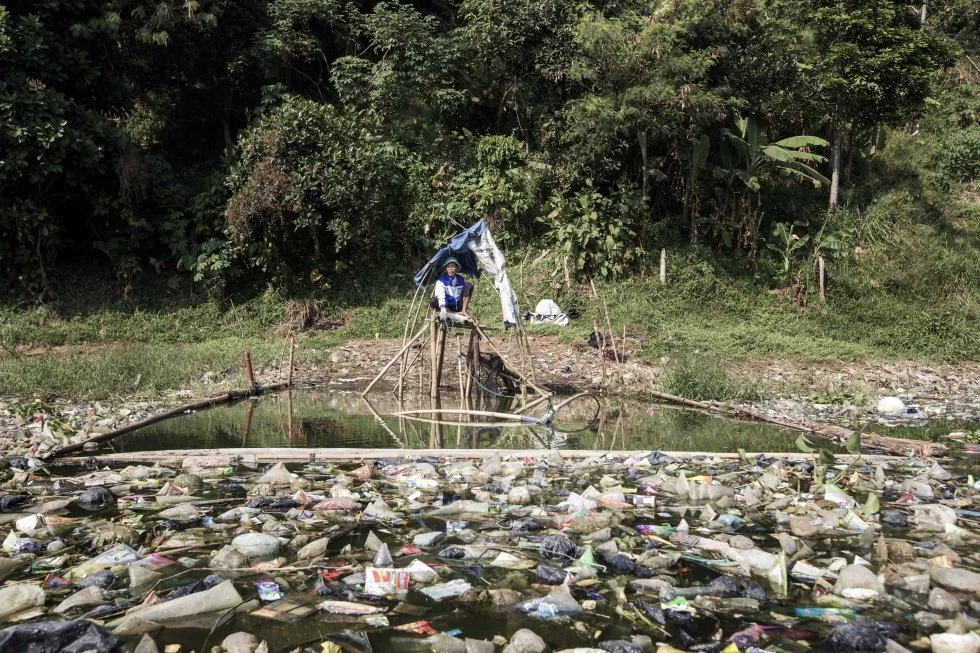 Cerca del pueblo de Cipatik, el curso del Citarum está totalmente cubierto por toneladas de basura tanto en superficie como en el lecho. Los desechos hacen imposible la navegación a motor, e incluso dificultan la de los botes a remo.
